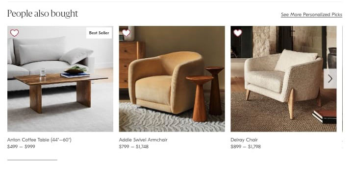 Again, West Elm gets it and of course, they don't miss the opportunity to feature limited-time discount deals to nudge those indecisive customers towards a purchase. Their "People also Browsed" section strategically highlights limited-time discounted items, playing on the fear of missing out (FOMO) and creating a sense of urgency. This Frequently Bought Together tactic can be highly effective in converting browsers into buyers, especially for those who are price-conscious or who thrive on the thrill of a good deal.