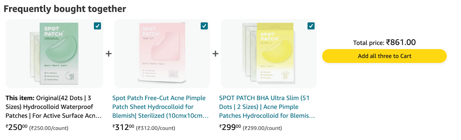 Amazon smartly promotes product bundles by displaying them as product recommendations on product pages. The buyer can even select/deselect items from the recommended bundle and see the price offered to them.