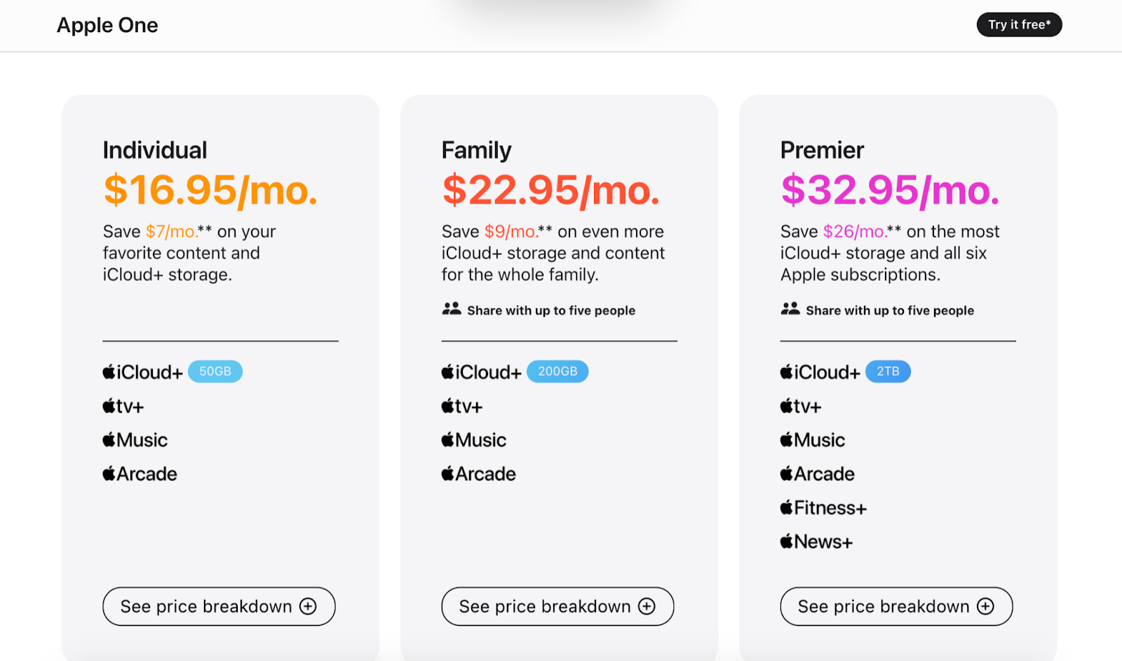 Another example of a good product bundle is that of Apple. One of their most popularly bundled purchases is the Apple One. Instead of having to purchase or subscribe to different services from Apple like music, TV, arcade, fitness, news, iCloud, and others, the bundles roll them all into one.